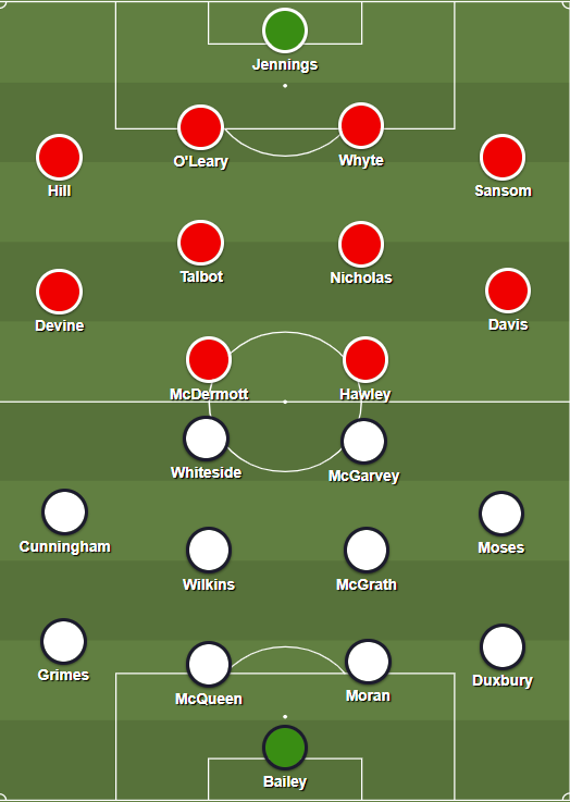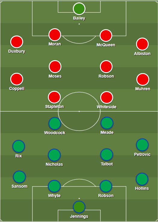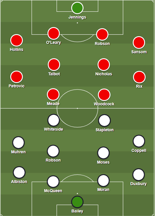 United kicked seven bells out of both statistics, producing their best performance for years to hammer Arsenal 4-2. It was a flattering scoreline – to Arsenal, whose keeper Pat Jennings was the Man of the Match. After 80 minutes, United were 4-0 up. United's manager Ron Atkinson later called it “one of the most devastating displays of power football I have ever witnessed”.